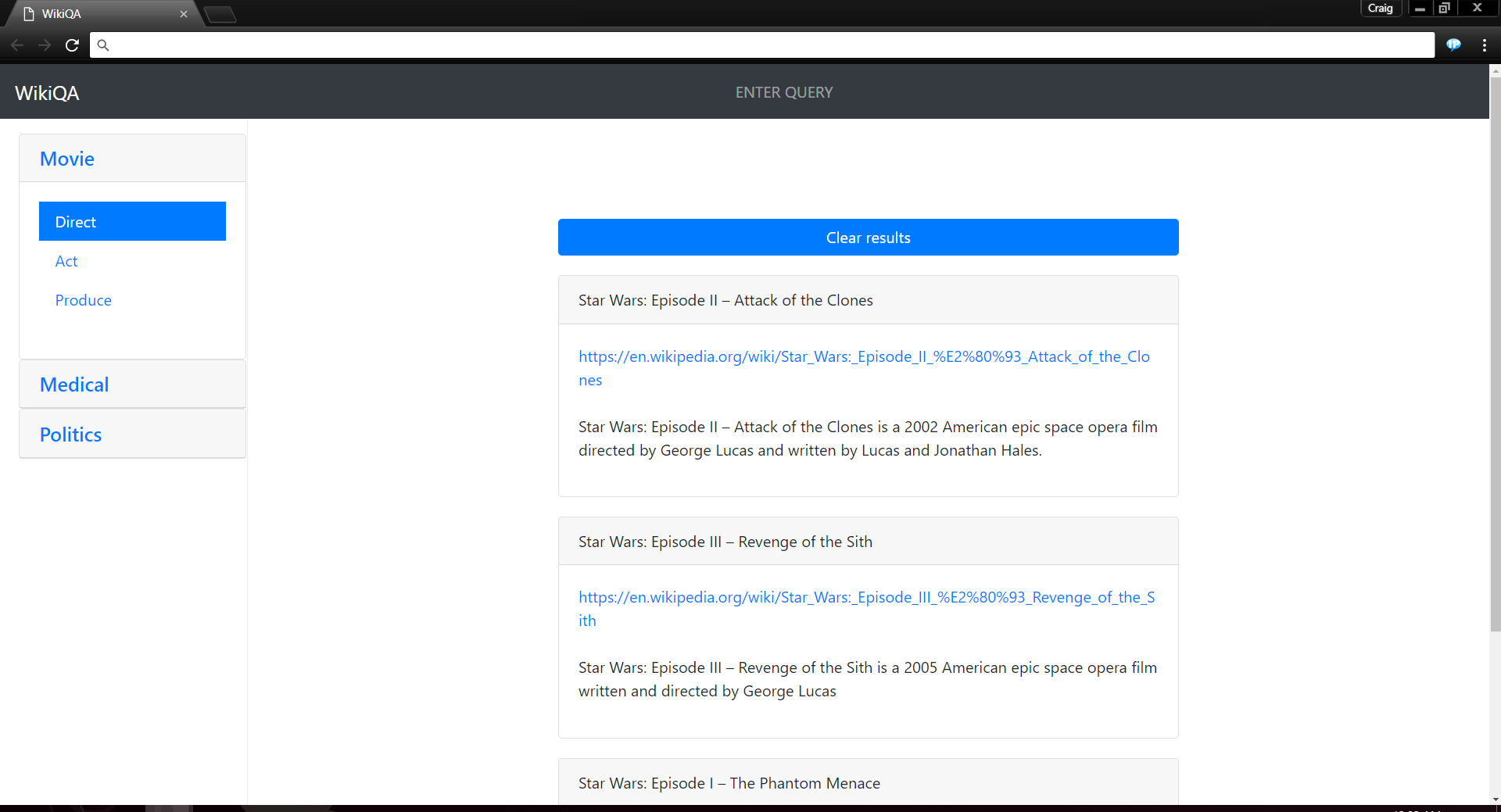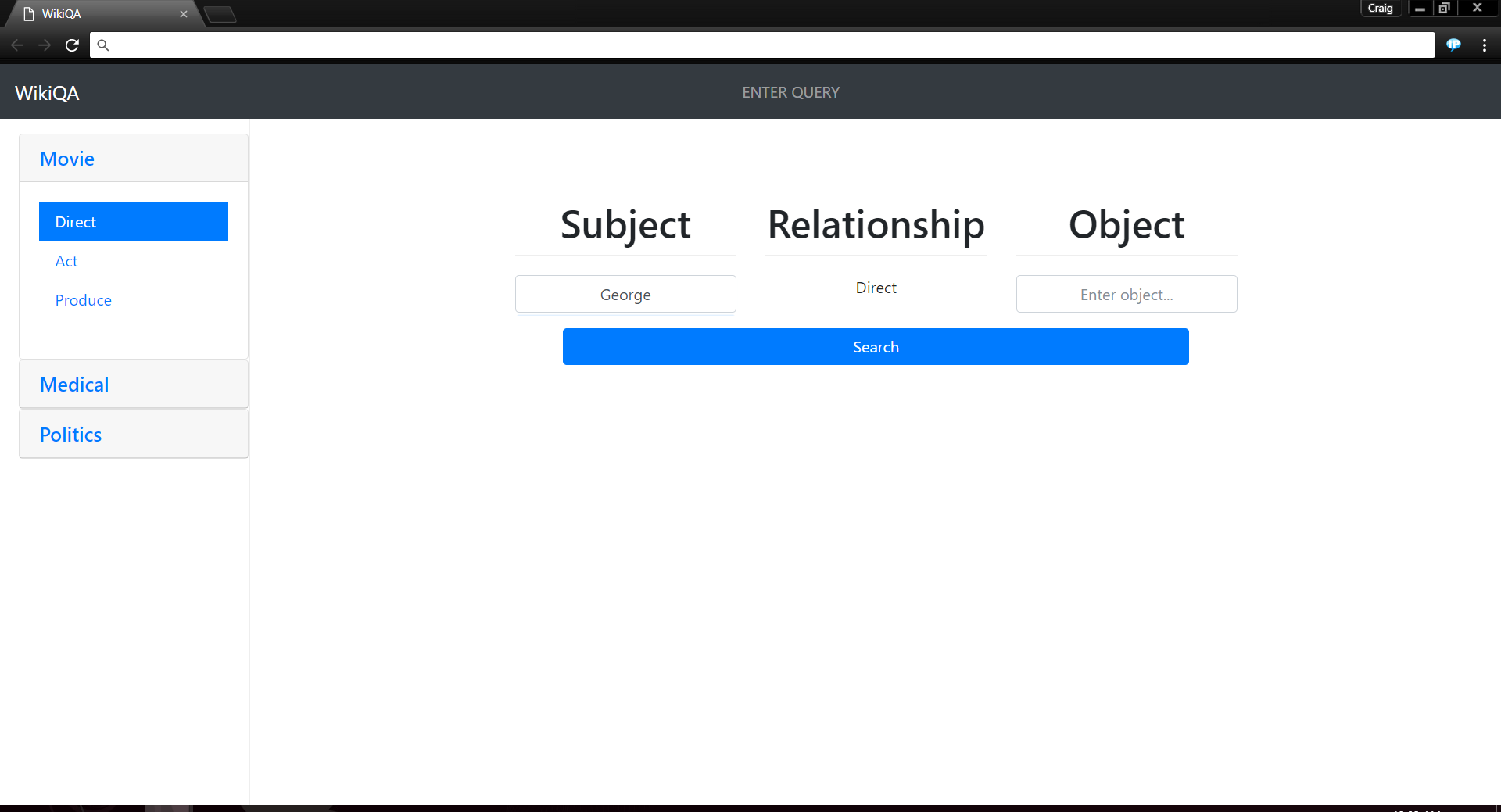 Extracting structured information from unstructured text has been a long-standing problem in the field of Natural Language Processing (NLP). However, effective approaches for text comprehension are still in the nascent stage. Question answering is one of the important applications of text comprehension. Although answering complicated questions posed by the users is a challenging task, we are investigating a system to automatically answer questions about relationships using the knowledge contained in Wikipedia. The WikiQA system utilizes an existing knowledge base with entities and relations extracted from Wikipedia articles. Text evidence is produced on-demand for relations between entities specified by users.