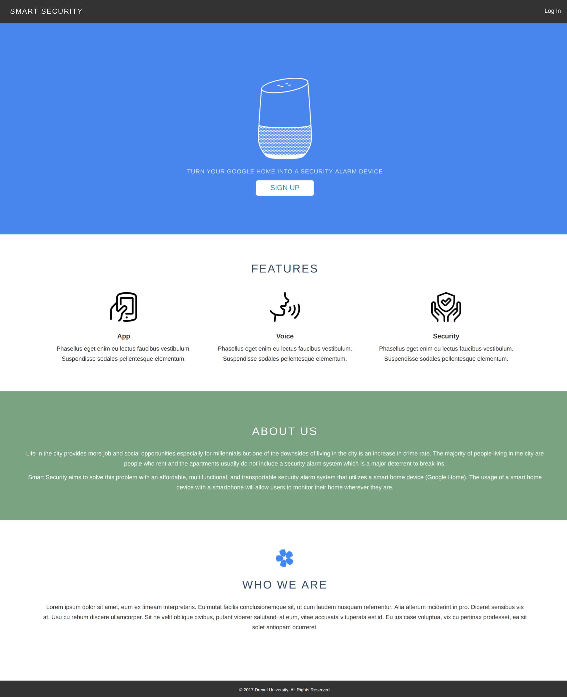 Smart Security aims to solve this problem with an affordable, multifunctional, and transportable security alarm system that utilizes a smart home device (Google Home). The usage of a smart home device with a smartphone will allow users to monitor their home wherever they are.